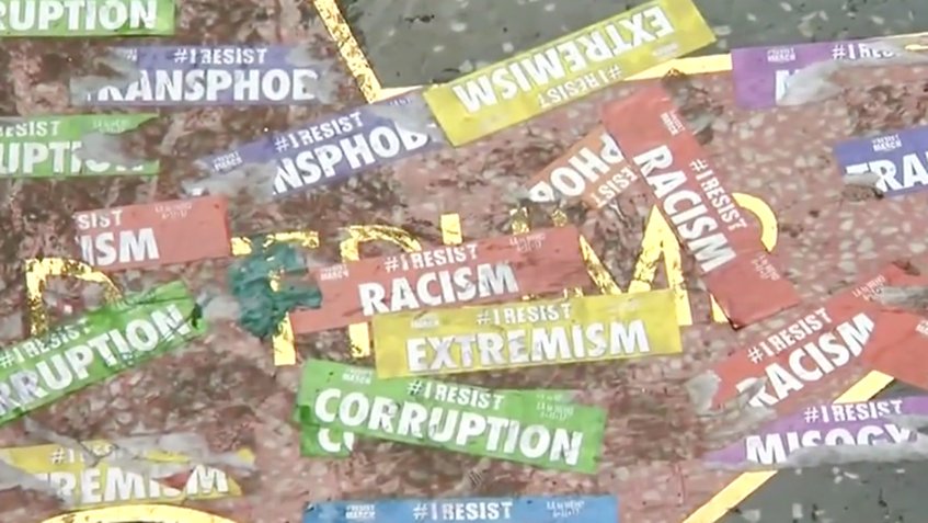 La estrella en el Paseo de la Fama de Hollywood del presidente norteamericano, Donald Trump volvió a ser «atacada», este vez con mensajes en contra del racismo, la homofobia, corrupción, en el marco de la “marcha de la resistencia” con motivo de la celebración del orgullo gay.