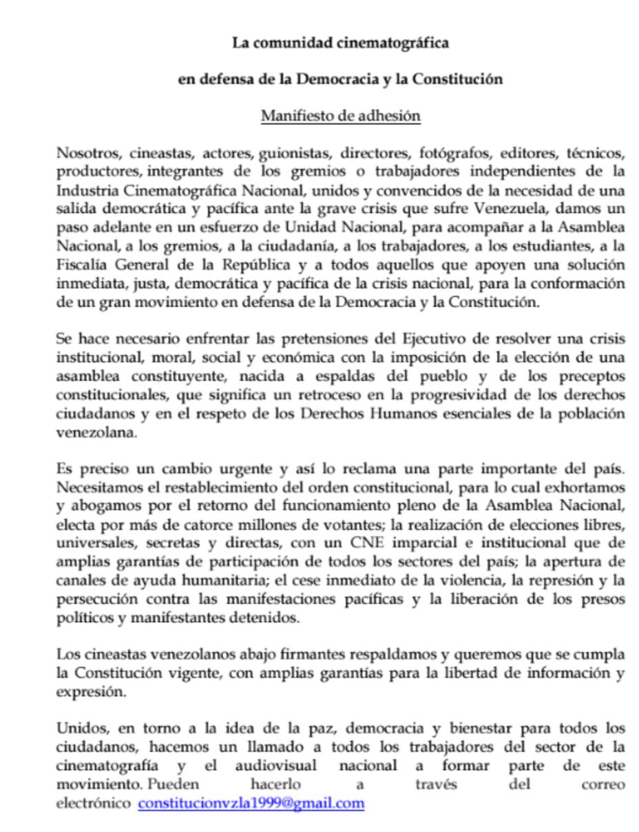 Un grupo de directores, actores, productores y demás trabajadores de la industria cinematográfica en Venezuela se opone a las pretensiones del gobierno de realizar una asamblea nacional constituyente, que consideran nacida a espaldas de la sociedad.