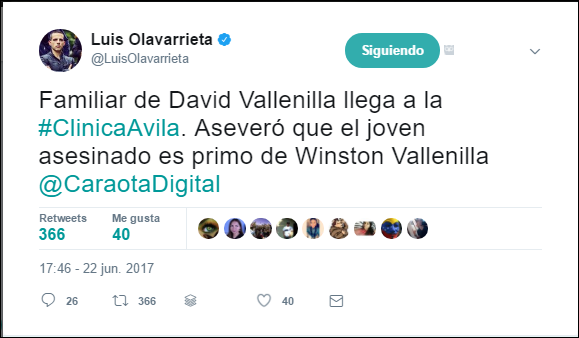 Olavarrieta, en su rol de periodístico también confirmó que el joven en cuestión era familiar del reconocido animador Winston Vallenilla, quien tiempo atrás criticó las protestas en contra del gobierno y también estuvo envuelto en una polémica tras la muerte de otro joven venezolano (Neomar Lander).