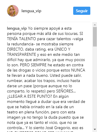 “Yo siempre apoyé a esta persona porque más allá de sus locuras, SI TENÍA TALENTO para cazar talentos -valga la redundancia- se mostraba siempre DIRECTO, daba rating, era ÚNICO Y TRANSPARENTE y eso en este medio tan difícil hay que admirarlo, ya que muy pocos lo son».