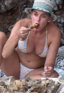 Otra de las imágenes que se volvió tendencia en cuestión de minutos fue una que la aleja por completo su imagen de figura “glamourosa” del espectáculo, y es que fue captada mientras comía pollo en una posición poco favorable.