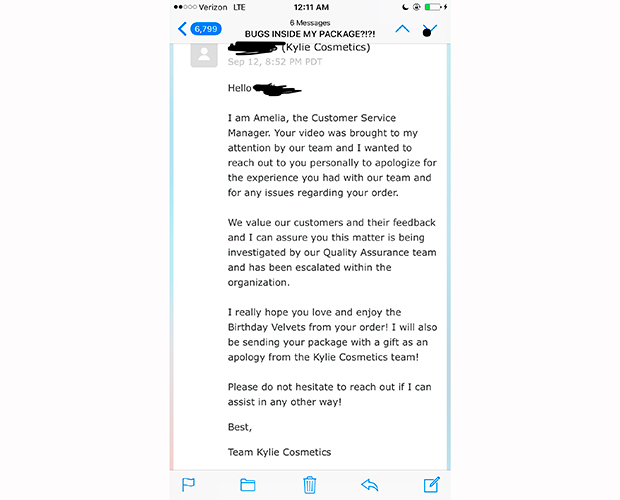 Debido a la repercusión que tomó el caso y los comentarios negativos hacia la marca de Kylie, la gerente de atención al cliente se puso en contacto con Em para disculparse y le garantizó que investigarían que sucedió. Además, recibiría el kit nuevamente junto con un regalo como forma de compensación por el mal momento.