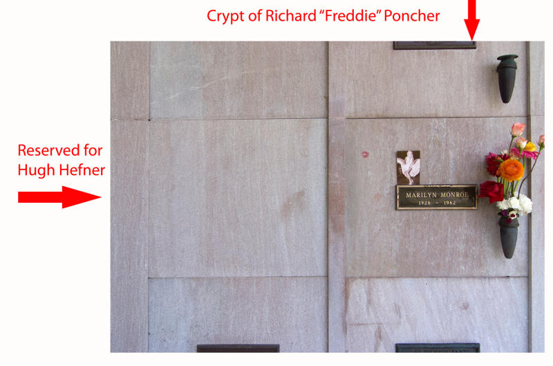 Sin embargo, aunque parece original, la idea de Hefner no lo es tanto, pues no es el único en el cementerio que quiso reposar la eternidad junto a Marilyn, Richard Freddie Poncher le compró al beisbolista Joe DiMaggio, ex esposo de Monroe, la tumba localizada justo arriba a la de Monroe.