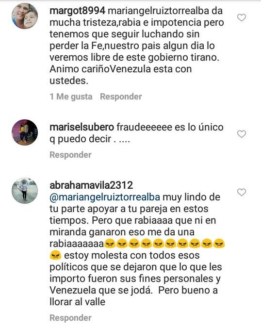 Según los resultados anunciados la noche de este domingo por el Consejo Nacional Electoral, Ocariz perdió la carrera por la gobernación, es por ello que algunos de los usuarios de esta red social criticaron el mensaje de apoyo de la animadora que reza «Nos toco vivir una época muy dura, que tristeza, seguimos con integridad» como una muestra de rendición ya que piensan que está reconociendo a Héctor Rodríguez como vencedor en la contienda.
