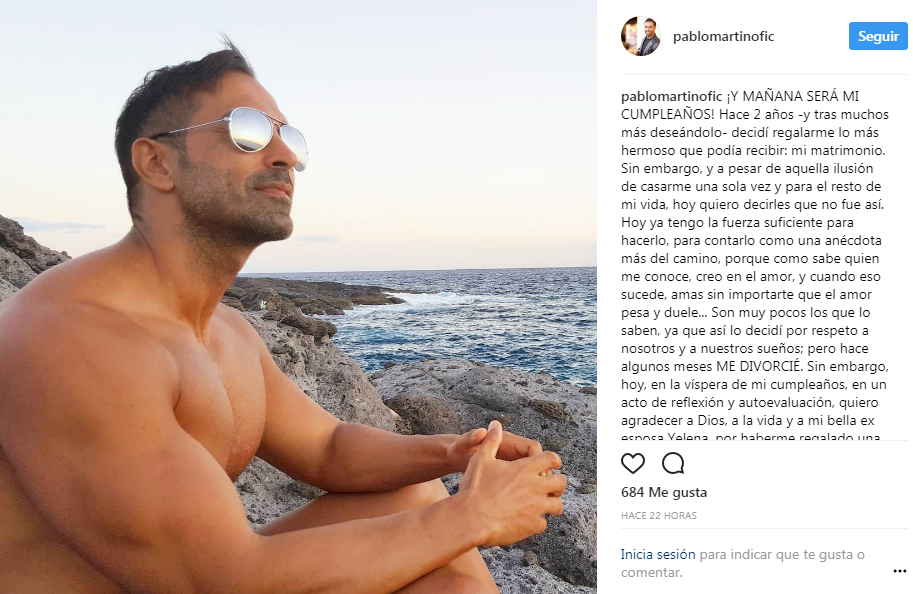 Hoy (lunes 16 de octubre) Pablo celebra un año más de vida; experiencia que compartió con sus seguidores a través de las redes sociales. A su vez, el también actor aprovechó la oportunidad para informar lo siguiente: “… hace dos años decidí regalarme lo más hermoso que podía recibir: mi matrimonio. Sin embargo, y a pesar de aquella ilusión de casarme una sola vez y para el resto de mi vida, hoy quiero decirles que no fue así. Hoy ya tengo la fuerza suficiente para hacerlo, para contarlo como una anécdota más del camino, porque como sabe quién me conoce, creo en el amor… Hace algunos meses me divorcié… en un acto de reflexión y autoevaluación, quiero agradecer a Dios, a la vida, y a mi bella ex esposa Yelena, por haberme regalado una etapa maravillosa y mágica” escribió.
