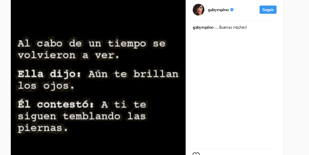 Sospechosamente la actriz desactivó los comentarios en la imagen y solo colocó como pie de foto la frase «Buenas noches». Mucho se ha especulado sobre una reconciliación entre ella y el padre de su hijo, el cantante Jeancarlo Canela, ¿será esta imagen la confirmación?