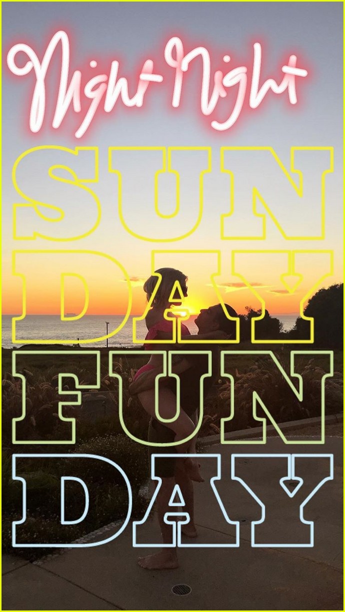 Gaga publicó la fotografía en sus Instagram Stories. En ella, aparece la artista de 31 años en bikini y sobre los brazos de su pareja, posando con un hermoso atardecer de fondo, acompañada del mensaje «Sunday Funday».