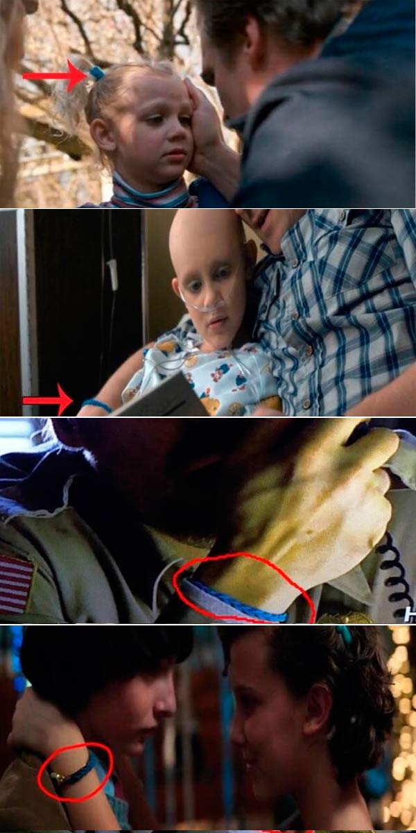 Como bien se ha dado cuenta un colaborador de Reddit, la niña de Hopper, Sara, usaba un coletero azul cuando era pequeña y llevaba dos coletas. Cuando la sometieron a quimioterapia y perdió el pelo, su padre comenzó a llevar ese mismo coletero en la muñeca. Ahora que ha acogido a Eleven, es ella quien lleva el coletero a modo de pulsera. Lo puedes ver en estas imágenes.