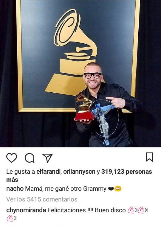 Muchos fueron los artistas venezolanos orgullosos que utilizaron sus redes sociales para felicitar a Nacho por este segundo Grammy, y contra todo pronóstico su ex compañero Chyno también lo felicitó.