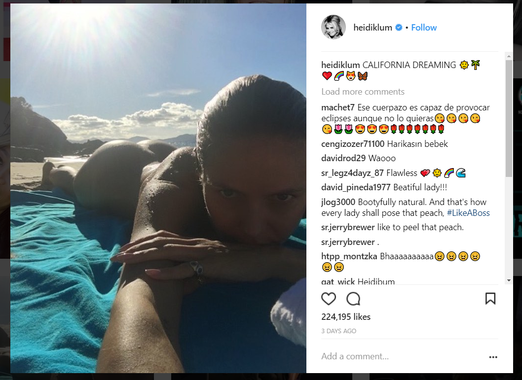 La hermosa y escultural modelo Heidi Klum ha mostrado sin tapujos en sus redes sociales la parte más «pomposa» de su cuerpo. Su última entrega en Instagram ha ido un poquito más allá, y si hace unos días nos cautivaba en bikini, ahora se lo quita y nos enseña su espectacular derriere.