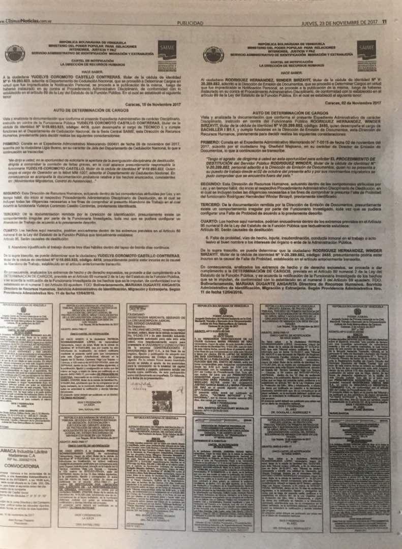 Según el anuncio de no presentarse en el lapso correspondiente se le nombrará defensor judicial con quien se tratarán los tramites del proceso. Los anuncios están firmados por los jueces Nathali Prú y Douglas Rodríguez.
