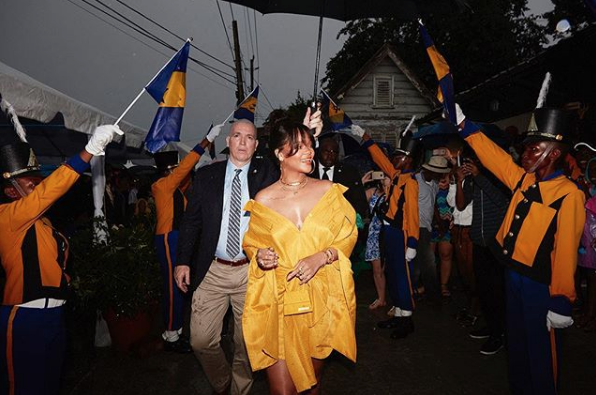 Aunque había mal clima, la intérprete de “Diamonds” asistió a la ceremonia acompañada de sus padres, y lució un impactante vestido amarrillo de Hellessy. Además aprovechó la oportunidad de compartir con los habitantes y fotografiarse junto a ellos.