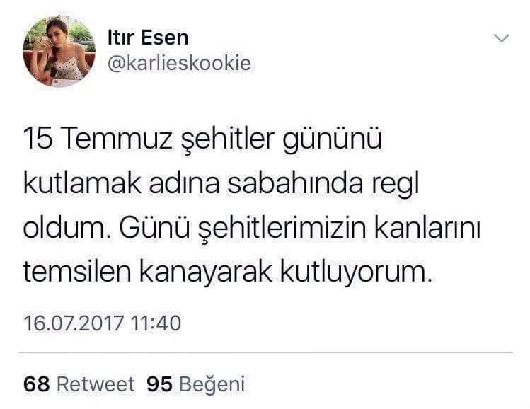 «Esta mañana me ha bajado la regla, en nombre de las víctimas del 15 de julio. Celebro el día de la sangre de los caídos, sangrando por ellos«, escribió Esen en Twitter.