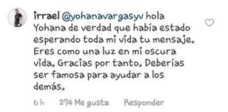 Por su parte, -y como era de esperarse- el ex de Kerly Ruiz no dudo en responder irónicamente, a pesar de que sus seguidores ya habían ofendido y catalogado de hipócrita a la también modelo. “Hola Yohana de verdad que había estado esperando toda mi vida tu mensaje. Eres como una luz en mi oscura vida. Gracias por tanto. Deberías ser famosa para ayudar a los demás”, escribió Irrael.