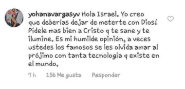 El mensaje le disgustó a la conductora de El Avispero, quien le comentó: “Hola Israel. Yo creo que deberías dejar de meterte con Dios! Pídele más bien a Cristo que te sane y te ilumine. Es mi humilde opinión, a veces a ustedes los famosos se les olvida amar al prójimo con tanta tecnología que existe en el mundo”.