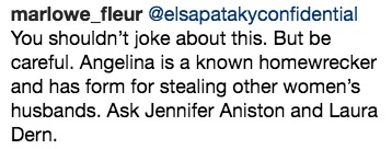 Los seguidores aseguraron que Chris es el nuevo objetivo para Angelina Jolie, quien está soltera luego de separarse de Brad Pitt. De hecho, Elsa Pataky, esposa de Hemsworth, entró al juego con un comentario sarcástico «Que gran pareja. Me refiero a ustedes, chicos»; y le respondieron: «No deberías bromear sobre esto. Ten cuidado. Angelina es una conocida ‘rompehogares’ y tiene fama de robar el marido a otras mujeres. Que le pregunten a Jennifer Aniston y Laura Dern».