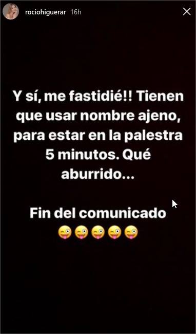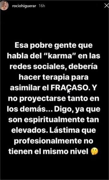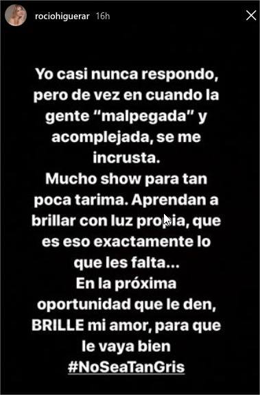 Por su parte, Rocío, dejando un poco de lado la diplomacia que la caracteriza, le respondió sin mencionarla específicamente. «Esa pobre gente que habla del ‘karma’ en las redes sociales debería hacer terapia para asimilar el fracaso (…) Mucho show para tan poca tarima. Aprenda a brillar con luz propia, que eso es exactamente lo que le falta. En la próxima oportunidad que le den, brille mi amor, para que le vaya bien #NoSeaTanGris».