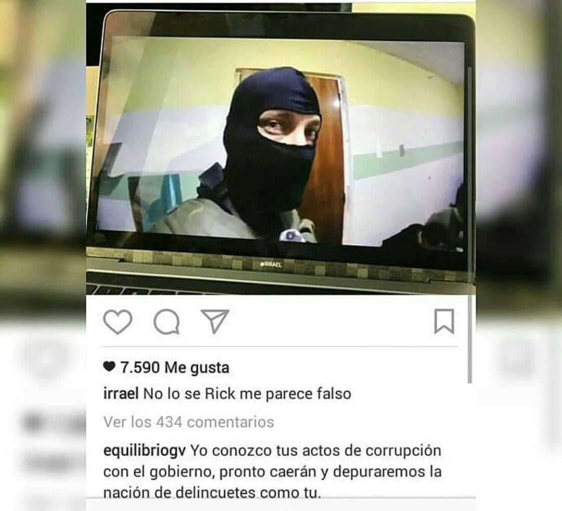 Entre ellas, llamó la atención una en la que el propio Óscar Pérez, a través de su cuenta en dicha red social (@equilibriogv) le escribió: «Yo conozco tus actos de corrupción con el gobierno. Pronto caerán y depuraremos la nación de delincuentes como tú».
