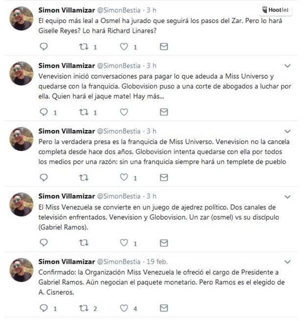 Además, expresó mediante su cuenta de Twitter que: «Venevisión inició conversaciones para pagar lo que adeuda a Miss Universo y quedarse con la franquicia. Globovisión puso a una corte de abogados a luchar por ella. Quien hará el jaque mate! Hay más…», publicó.