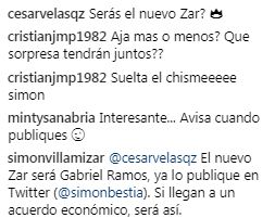 En su cuenta de Instagram, Villamizar publicó una imagen junto a Osmel Sousa y un seguidor le preguntó quién sería el nuevo presidente, a lo que el periodista respondió: «El nuevo Zar será Gabriel Ramos. Si llega a un acuerdo económico, será así».