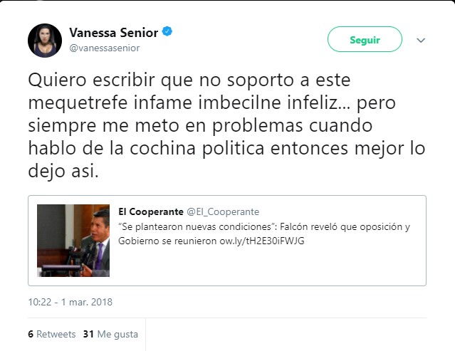 Luego de esto, Senior publicó en su cuenta de Twitter: «Quiero escribir que no soporto a este mequetrefe infame imbécil e infeliz… pero siempre me meto en problemas cuando hablo de la cochina política entonces mejor lo dejo así».