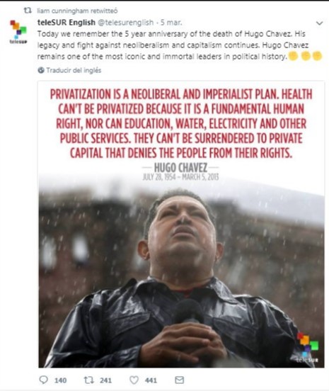 «Hoy recordamos el quinto aniversario de la muerte de Hugo Chávez. Su legado y lucha contra el neoliberalismo y el capitalismo continúa. Hugo Chávez sigue siendo uno de los líderes más emblemáticos e inmortales en la historia política«, es el tuit publicado por el canal de televisión y que Cunningham compartió en su perfil personal.