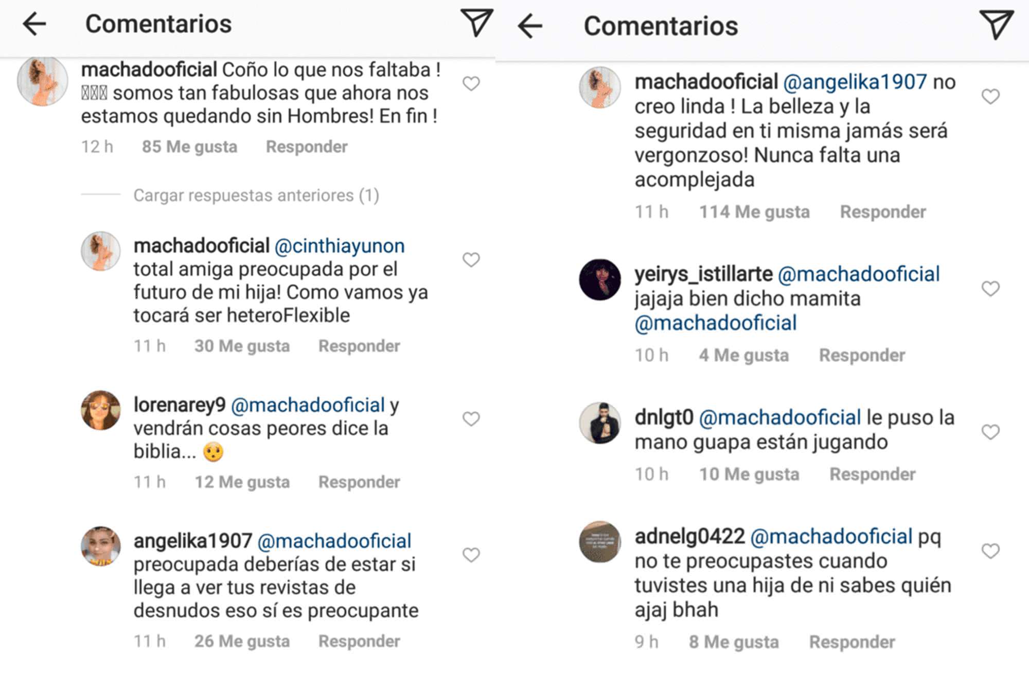 De igual forma, la venezolano aseguró estar preocupada por el futuro de su hija. «Como vamos, ya tocará ser heteroflexible», respondió. Ese comentario hizo que alguien le respondiera que debería estar preocupada por el momento que su hija vea todos los desnudos en revistas que ha hecho y Machado contestó contundentemente: «No creo linda, la belleza y la seguridad en ti misma jamás será vergonzoso. Nunca falta una acomplejada».