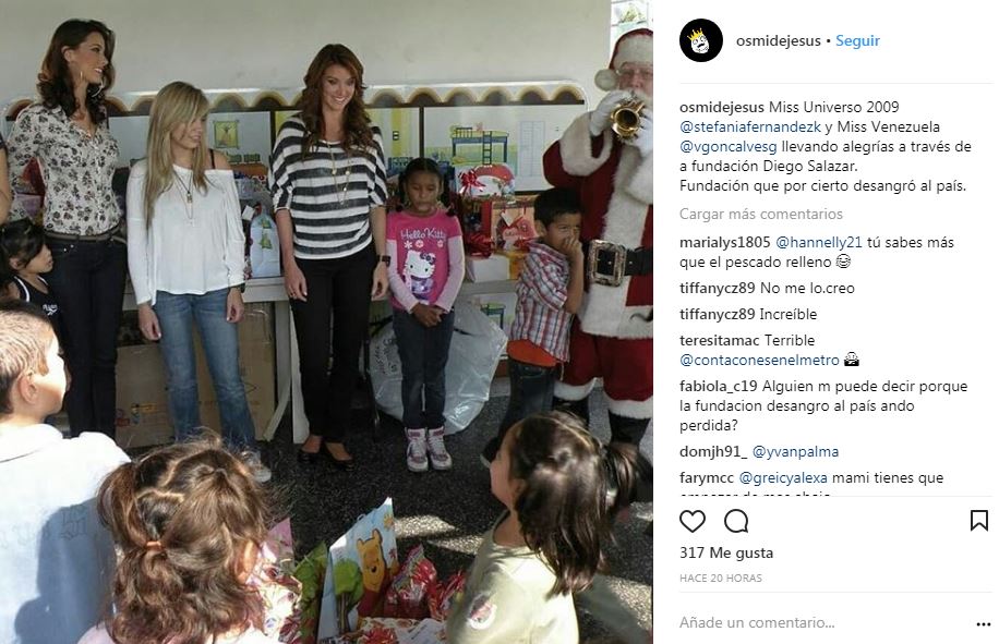 Entre las imágenes compartidas, se pudo ver a la modelo, empresaria y recordada Miss Venezuela 2008 y Miss Universo 2009 Stefanía Fernández realizando actos benéficos con la mentada fundación que, según la animadora y Miss Intercontinental 2009, Hanelly Quintero, habría «repartido alegría a los más necesitados mientras a ellas (las misses) le llenaban la cuenta en dólares sacados del desangre de PDVSA».