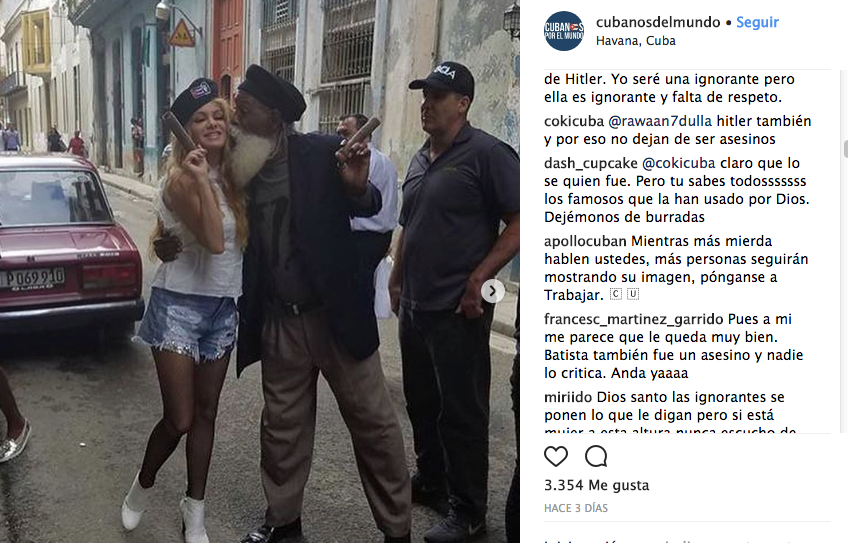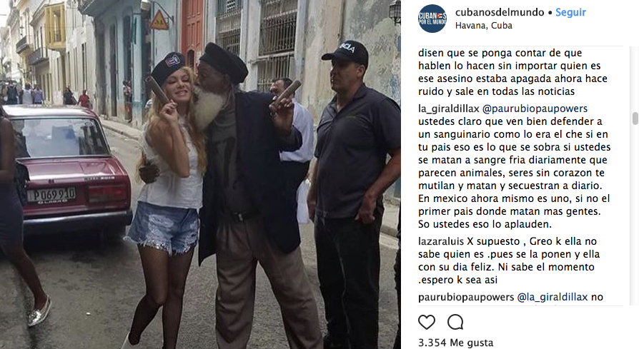 La Chica Dorada se muestra posando con una boina que lleva la foto del fallecido guerrillero Ernesto “El Che” Guevara. En la foto que ha circulado se la ve junto a un anciano de barba blanca y un enorme tabaco.
