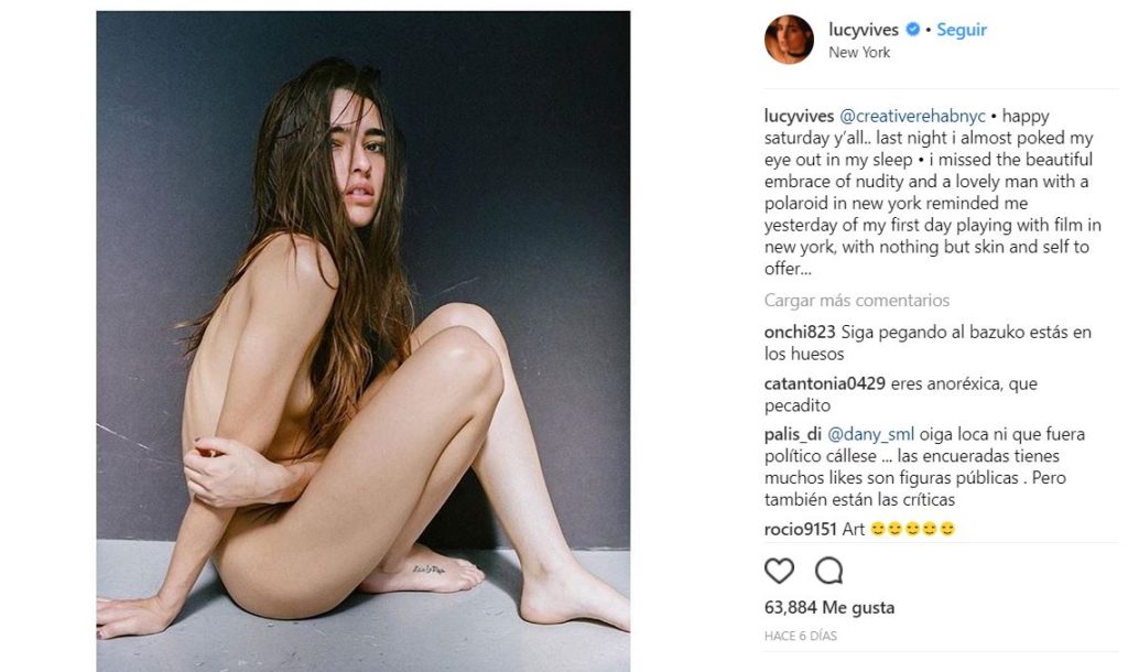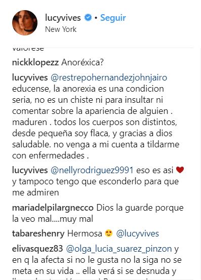 Lucy, la hija del cantante Carlos Vives fue victima de una gran cantidad de críticas luego de publicar una foto desnuda en su Instagram, pues según sus seguidores luce mucho más delgada que de costumbre. Algunos opinaron: «EXTREMADEMENTE DELGADA!», otros «Qué asco de mujer» «Qué fea». A lo que la joven respondió con dureza que no tiene problemas de salud, dejó implícito el cuidado que deben tener las personas al emitir juicios, más aún cuando se trata de hechos delicados como enfermedades.