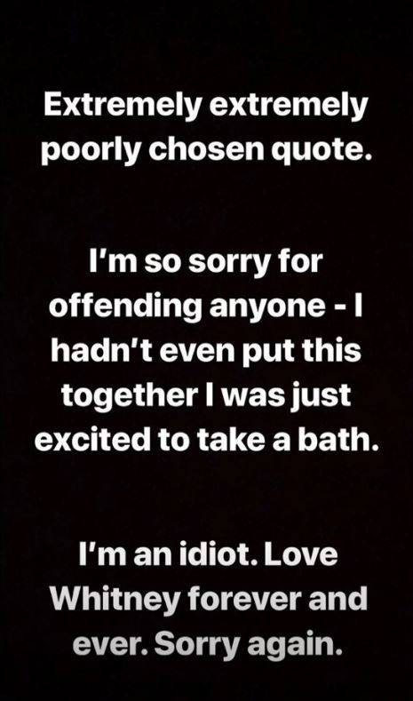 “Cita sumamente mal elegido. Lo siento por ofender a alguien, ni siquiera había armado esto, estaba emocionada de tomar un baño. Soy una idiota. Amaré por siempre a Whitney. Lo siento de nuevo”, señaló la artista de Nueva Zelanda.