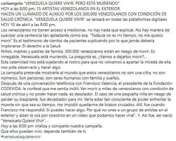 Más allá de sentir un vacío por el país y las personas a quienes dejaron en él, un grupo de artistas se unieron para viralizar una campaña que se publicará hoy a las 8:00 p.m. la misma lleva por nombre: «Venezuela quiere vivir». La periodista Carla Angola publicó en su red social Instagram una fotografía junto a sus compañeros: George Harris, Camila Canabal, Ronald Borjas, Dayra Lambis, Verónica Rasquín, Marko Música y lo acompañó del siguiente mensaje:
