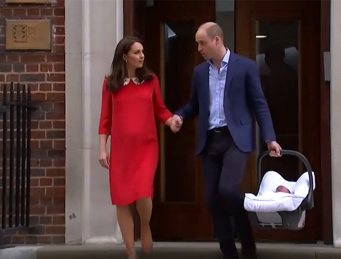 Solo siete horas después de dar a luz a su tercer hijo, los Duques de Cambridge han abandonado el hospital St. Mary en Paddington (Londres) con su niño. Muy emocionados y con una gran sonrisa en su rostro, el príncipe Guillermo y su esposa, que llevaba en sus brazos al pequeño, han saludado a todos los periodistas, fotógrafos y curiosos que se encontraban en las inmediaciones del centro para vivir en primera persona este momento tan especial y emocionante. El bebé, que ha pesado 3,900 kilogramos, es el tercer nieto del príncipe Carlos, el sexto bisnieto de Isabel II y ocupa el quinto puesto en la línea de sucesión al trono británico.