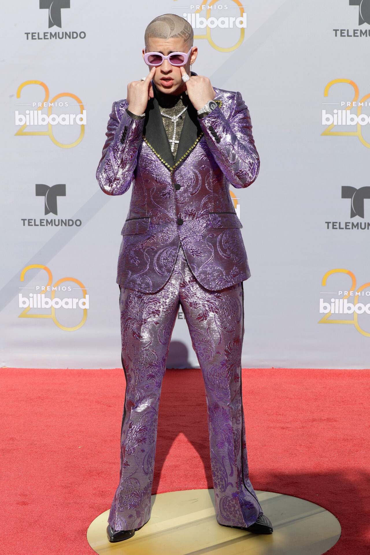 El rapero puertorriqueño deslumbró, pero literalmente, literalmente con este esmoquin reflectante en color morado.