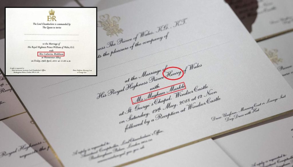 En la invitación a la boda real del príncipe Harry a su novia Meghan “se refiere como Ms (Doña)”, mientras en la tarjeta del matrimonio del príncipe William, en 2011, “para [su entonces prometida] Kate [Middleton] se utilizó el de Miss (señorita)”, indicó el medio, y luego explicó: