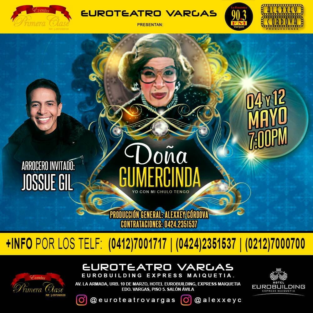 Este viernes 4 y sábado 12 de mayo, Doña Gumercinda llegará al Hotel Eurobuilding Express Maiquetía del estado Vargas en dos únicas funciones de «Yo con mi chulo tengo» para decir sus verdades en medio de ese humor negro que la caracteriza. El encuentro será a las 7:00 pm, en el Salón Ávila.
