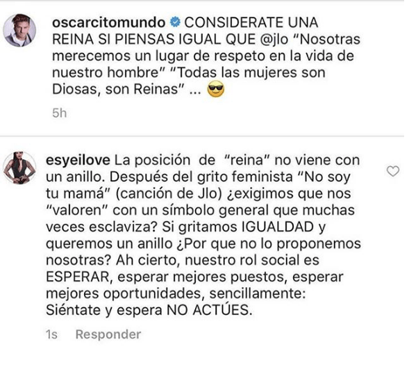 En esa publicación, YeiLove comentó: «La posición de reina no viene con un anillo. Después del grito feminista No soy tu mamá (canción de JLO), ¿exigimos que nos valoren con un símbolo general que muchas veces esclaviza? Si gritamos igualdad y queremos un anillo, ¿por qué no lo proponemos nosotras? Ah cierto, nuestro rol social es esperar, esperar mejores puestos, esperar mejores oportunidades, sencillamente. Siéntate y espera no actúes«.