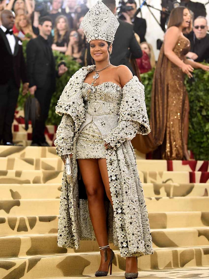 Apegada al código de vestimenta de la velada, Rihanna lució el polémico atuendo, consistente en vestido, abrigo (esta vez sin cola) y hasta su propia versión de la mitra, todo en un color blanco y plagado de piedras y bordados que Margiela diseñó en exclusivamente para la ocasión.