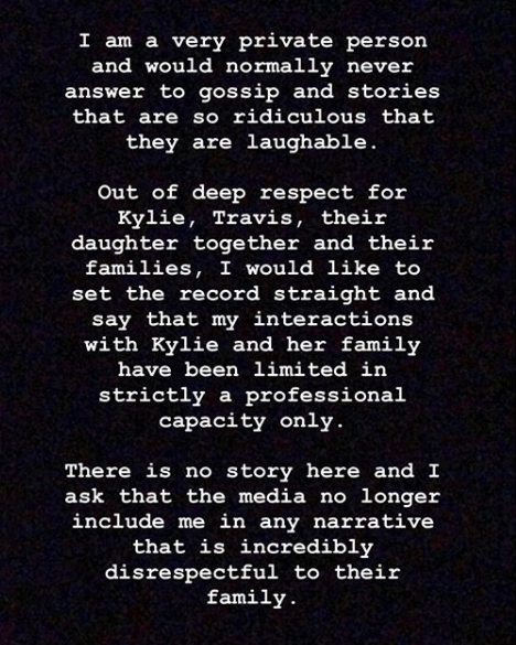 «Soy una persona muy reservada y normalmente no respondería a chismes y cuentos tan ridículos que son para reírse. Con profundo respeto por Kylie, Travis, la hija de ambos y sus familias, me gustaría dejar las cosas claras y decir que mis interacciones con Kylie y su familia han sido limitadas estrictamente a lo profesional.