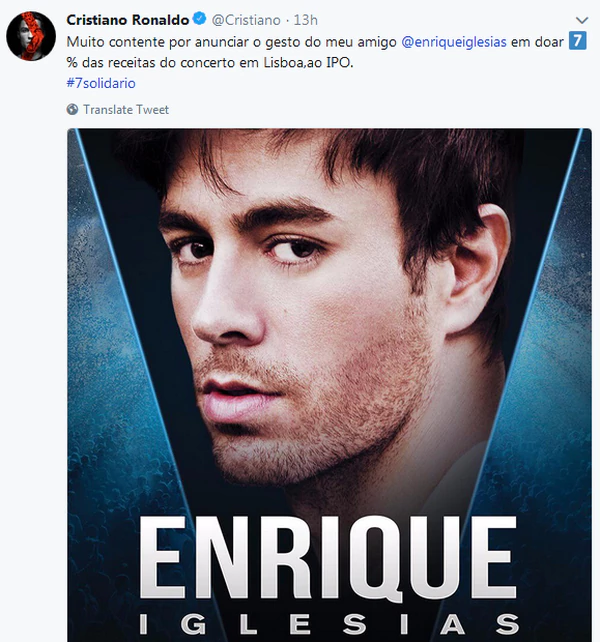 Enrique Iglesias donará un 7% de lo que ingrese por este evento, cifra que coincide con el número del dorsal en el Real Madrid del jugador Cristiano Ronaldo, que este miércoles se ha encargado de anunciar y festejar esta iniciativa.