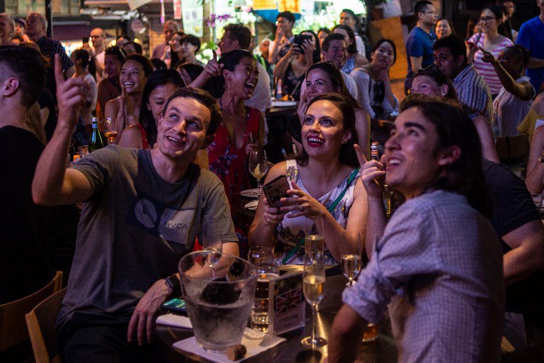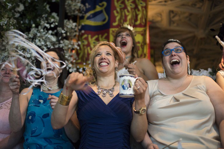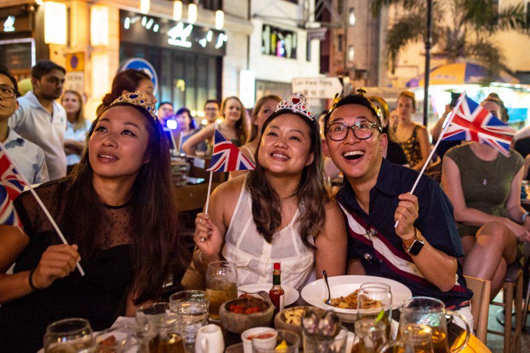 Es de madrugada y la gente se vistió lo más cómoda posible -ropa deportiva, camisetas, pijamas-, aunque no podía faltar el toque “monárquico” con los lazos y sombreros que muchas decidieron vestir.