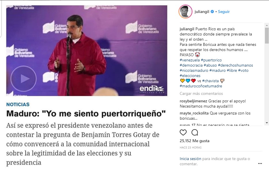 En medio de su respuesta, el político aseguró sentirse puertorriqueño. Ante esto, Julián Gil recurrió a su cuenta de Instagram para responderle a Maduro publicando una captura de pantalla del titular difundido por el medio El Nuevo Día. «Puerto Rico es un país democrático donde siempre prevalece la ley y el orden … Para sentirte Boricua antes que nada tienes que respetar los derechos humanos …. PAYASO«, fue lo que escribió el artista.