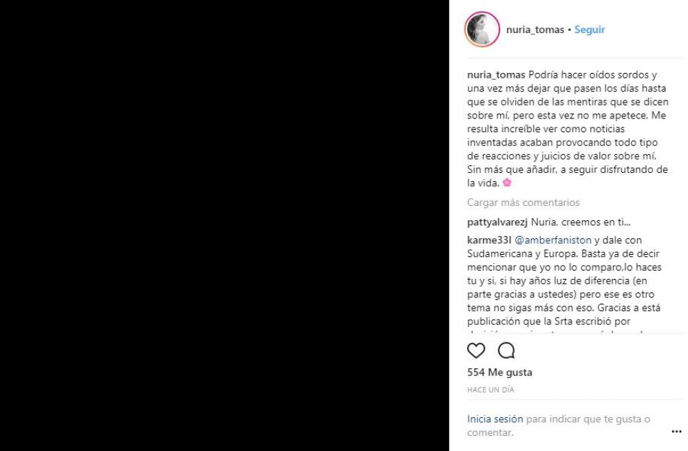 En una publicación de Instragram, la actriz española que sostuvo un noviazgo con Gerad por seis años escribió lo siguiente: «Podría hacer oídos sordos y una vez más dejar que pasen los días hasta que se olviden de las mentiras que se dicen sobre mí, pero esta vez no me apetece. Me resulta increíble ver como noticias inventadas acaban provocando todo tipo de reacciones y juicios de valor sobre mí. Sin más que añadir, a seguir disfrutando de la vida. ?», concluyó.
