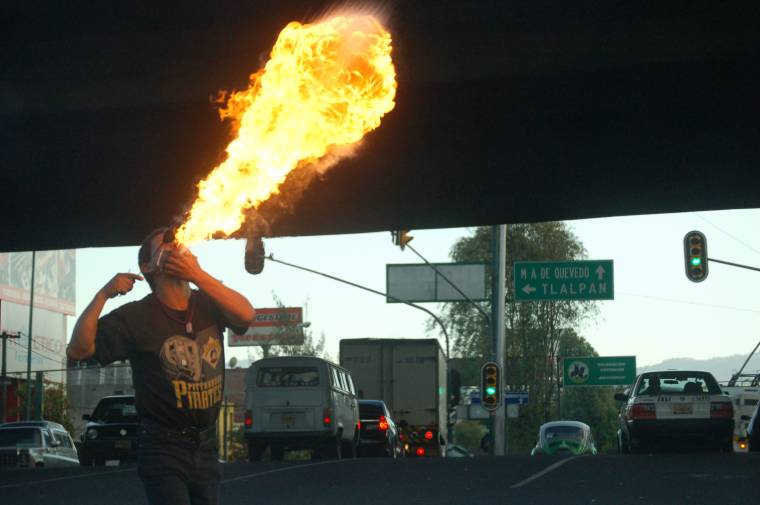Para tal propósito, el hombre se enrolló un trapo en la mano a manera de antorcha y vertió una sustancia combustible en su boca. Sin embargo, al momento de escupir el líquido el fuego alcanzó su rostro y por algunos segundo intenta apagar las llamas.