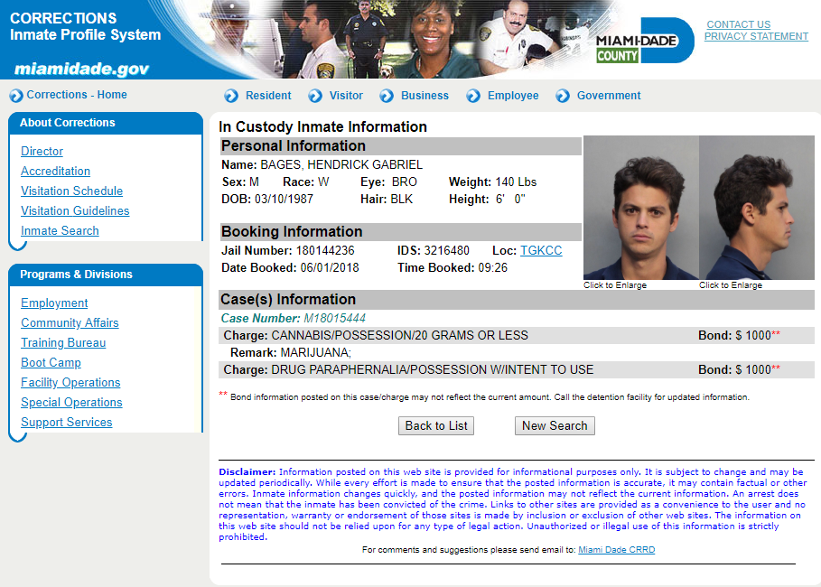 Al salir de allí, fue detenido por las autoridades americanas por poseer 20 gramos o menos de marihuana para su consumo, según el expediente policial que puede apreciarse en la página oficial del condado de Miami Dade.