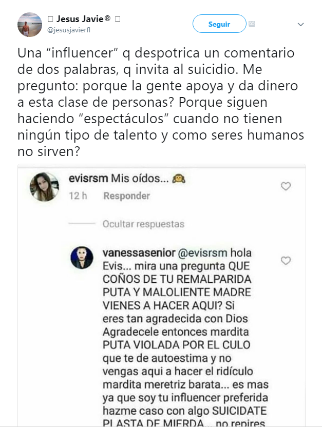 En una de sus publicaciones, una de sus seguidoras comentó «Mis oídos» haciendo referencia a la nueva faceta de Vanessa como cantante, «Es más ya que soy tu influencer preferida hazme caso con algo, suicídate plasta de mierda…» fueron parte de las fuertes palabras que tuvo Senior como respuesta.