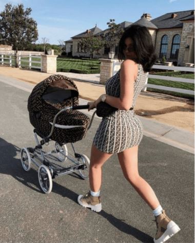 Kylie, posó en la foto y lo que más llamó la atención de sus seguidores, fue el portabebé Gucci con el que sostiene a su primogénita. Pues se dieron la tarea de indagar el precio de la costosa prenda.