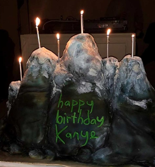 La torta tenía la forma de la cordillera de Teton en Rocky Mountains, en el estado de Wyoming, un lugar muy especial para el cantante ya que es donde ha grabado su nuevo trabajo discográfico, según información de People en Español. “¡Feliz cumpleaños, Kanye!”, estaba escrito sobre ella en letras verdes.