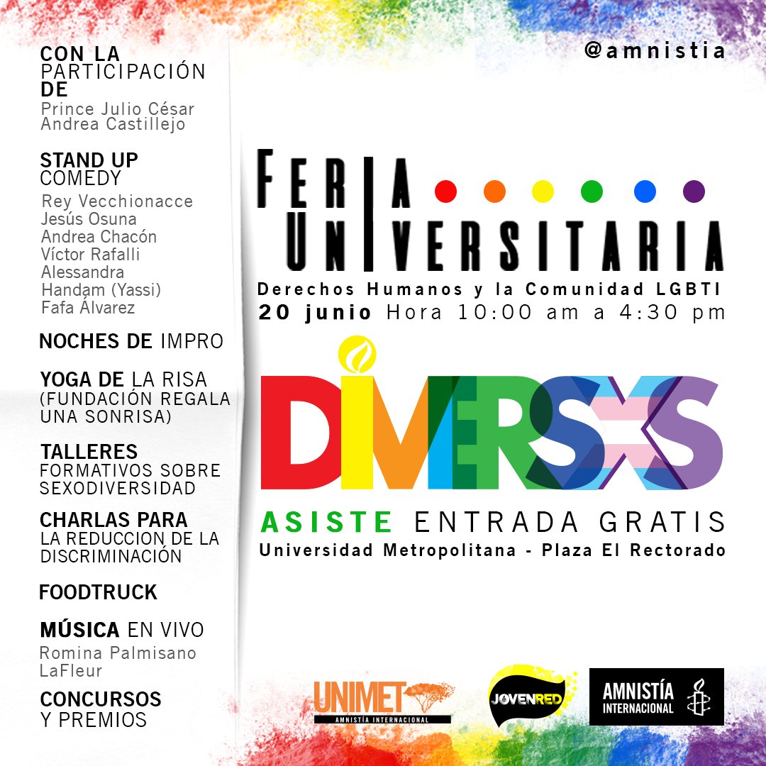 Este 20 de junio desde las 10:00 a.m. la Red de Jóvenes de Amnistía Internacional Venezuela te invita a la Feria Universitaria Diversxs en los espacios abiertos de la Plaza del Rectorado de la Universidad Metropolitana (UNIMET), en Caracas, con entrada gratuita.