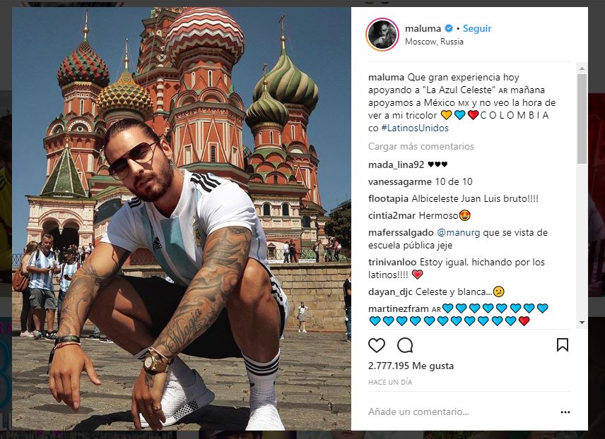El cantante colombiano quien se encuentra en Rusia, posteó una fotografía apoyando a la selección Argentina y escribió: Hoy apoyando a «La Azul Celeste» cuando en realidad el apodo del equipo es «Albiceleste».